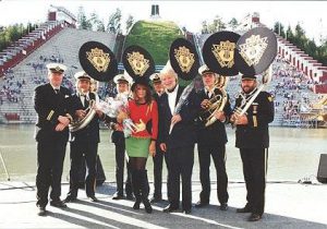Skianlegget i Holmenkollen har Kampen Janitsjarorkester spilt mang en gang. I 1992 underholdt vi sammen med Wenche Myhre etter at Manpowerstafetten var ferdig. Her er noen av «gutta» fotografert sammen med Wenche og Frode Thingnæs. Kampen Janitsjarorkester hadde et langsiktig samarbeid med Manpower over flere år, om det skyldtes at vi er et rent mannekorps er usikkert. Wenche Myhre har samarbeidet med Kampen Janitsjarorkester siden 1963 og hun er også eneste kvinnelige medlem, og æresmedlem.